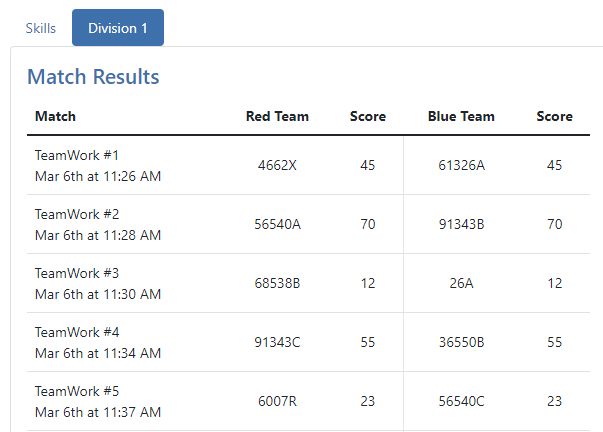 Zde je příklad výsledků hodnocených dovedností z turnaje VEX IQ Robotics Competition.