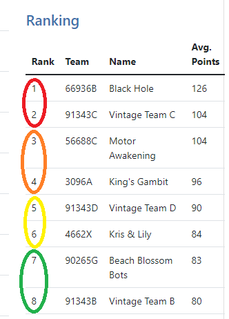 Výsledky z kvalifikačních zápasů se používají k určení pořadí týmů ve finálových zápasech. Pořadí se určuje podle průměrného skóre týmu a remízy se lámou odstraněním nejnižších skóre týmů a přepočítáním. Zde je část ze seznamu kvalifikačních zápasů z turnaje VEX IQ Robotics Competition. Týmy na 1. & 2. místě (označené červeně) budou spárovány jako aliance, poté týmy na 3. & 4. místě (označené oranžově) a tak dále.