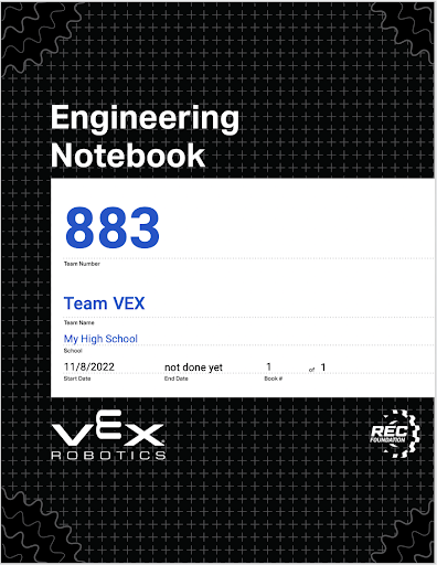 VEX Robotics ha preparado plantillas para cuadernos de ingeniería, que hacen que comenzar tu primer cuaderno de ingeniería digital sea lo más fácil posible. Simplemente agregue sus pensamientos, ideas, estrategia, diseños de robots y código y documente su proceso de iteración. Cada plantilla también tiene un cuaderno de ejemplo con consejos para equipos.