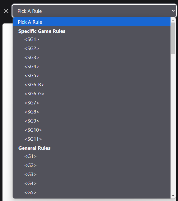 El icono de "libro" en la esquina superior derecha de las pantallas del evento se vincula a una interfaz de selección de reglas para el manual del juego que coincide con el tipo de evento.