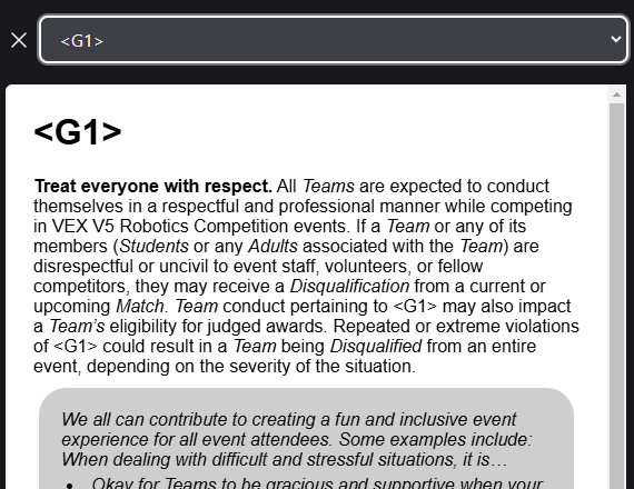 Taisyklės tekstas paimtas iš RobotEvents.com duomenų rinkinio, naudojamo oficialioje Q&A sistemoje, ir ne visada gali atspindėti naujausią žaidimo vadovo versiją. Jei yra skirtumų tarp taisyklių parinkiklio ir naujausio žaidimo vadovo, oficialus žaidimo vadovas yra teisinga versija.