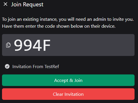 - 然后,主用户将在自己设备上的“邀请”界面输入该代码并选择“邀请 [用户名]”。 为了赋予该额外用户管理员权限(添加和删除实例中的其他用户),他们还可以选择“邀请为管理员”。