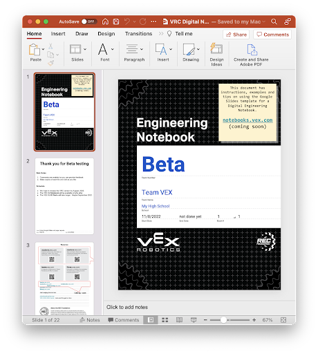 VEX Robotics 已准备了工程笔记本的模板,让您可以尽可能轻松地启动您的第一本数字工程笔记本。 只需添加您的想法、想法、策略、机器人设计和代码并记录您的迭代过程。 每个模板还包含一个示例笔记本,其中包含针对团队的提示。