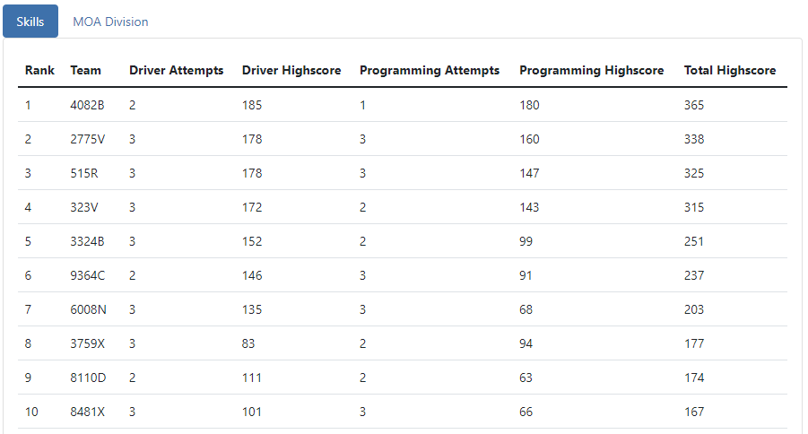 这是 VEX V5 机器人竞赛排名技能结果的一个例子。